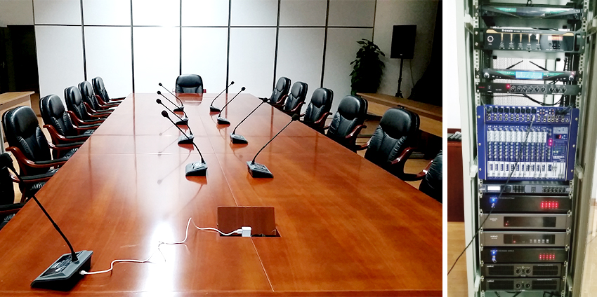 該項(xiàng)目是由我公司負(fù)責(zé)前期設(shè)計(jì)以及設(shè)備提供和安裝調(diào)試。會(huì)議室面積10×12米,整體設(shè)計(jì)包含以下系統(tǒng):會(huì)議擴(kuò)聲系統(tǒng),多媒體顯示系統(tǒng),無線手拉手會(huì)議系統(tǒng)及中央控制系統(tǒng)。